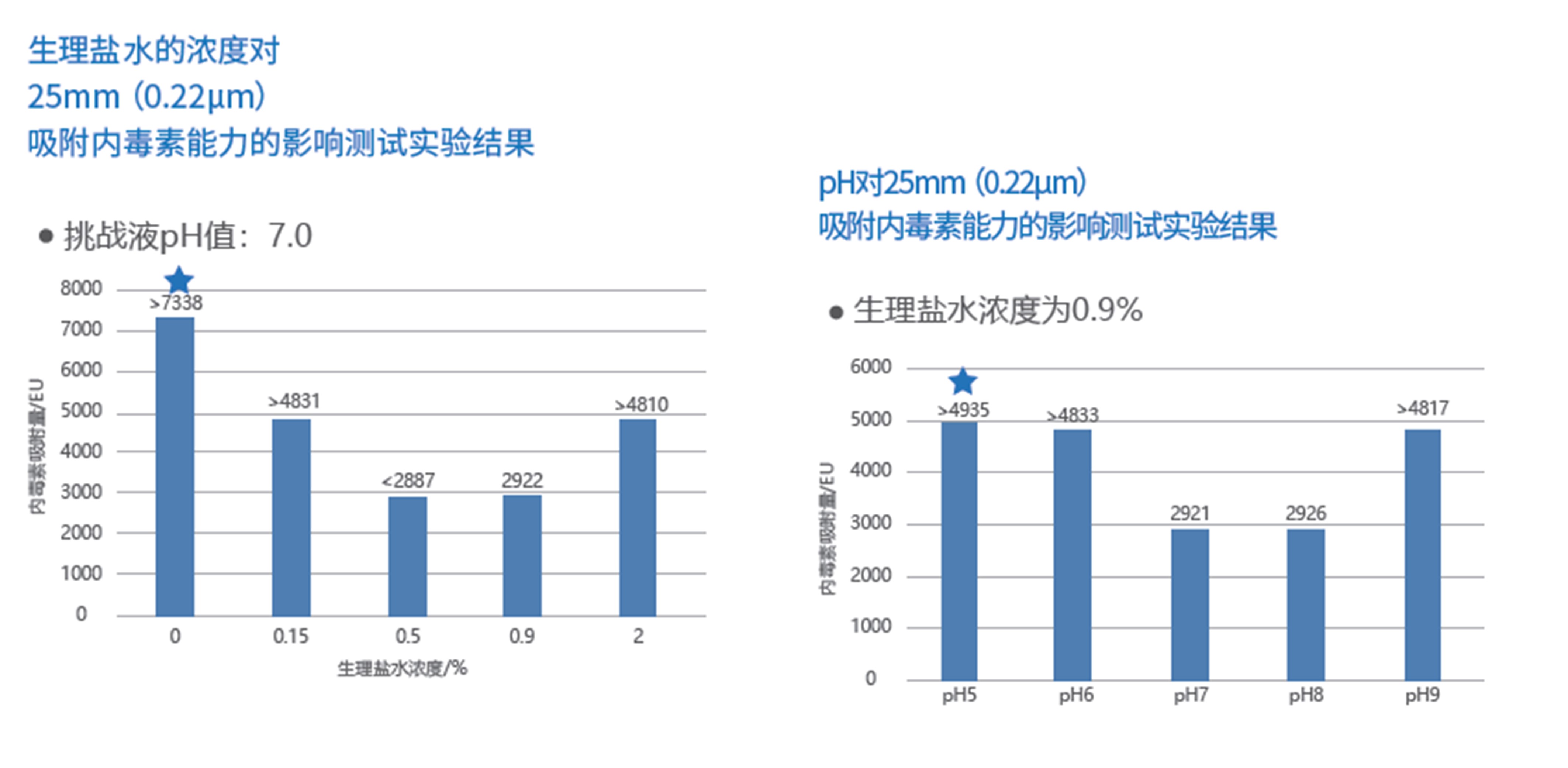 以95%吸附率为评价标准,内毒素生理盐水挑战液浓度:50~100 EU/mL, 流速1.34 mL/min/cm2,动态吸附载量为980EU/cm2 |